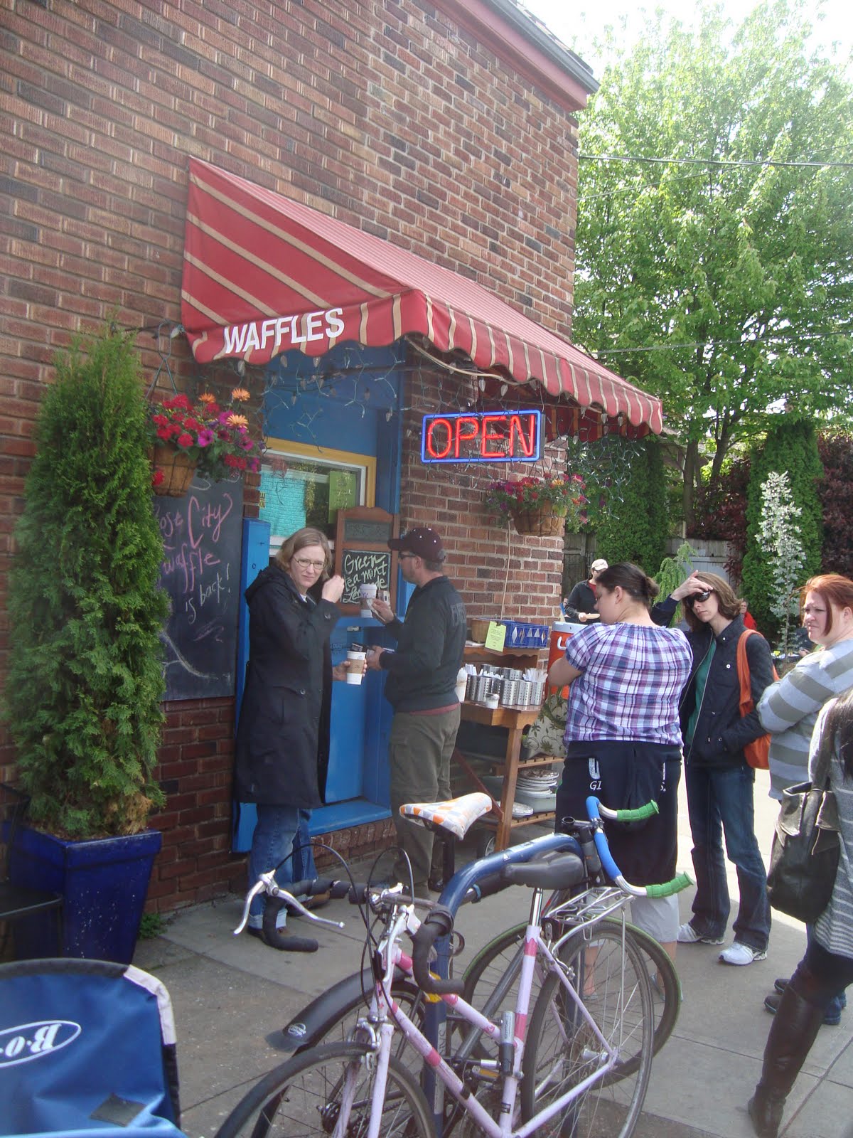Waffle Window and knew it was a for sure stop for us. They have endless combinations. Dessert, breakfast, snack, whatever it is, you can find it at the Window. We ordered, waited, and sat outside in a sort of parking lot picnic area. The day was impossibly sunny, and we were psyched.